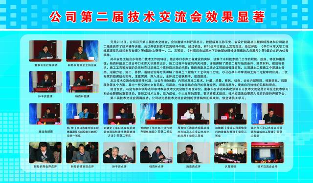 2014年元月2日—3日,公司召開(kāi)第二屆技術(shù)交流會(huì ),會(huì )議邀請省水利廳原總工孫平安、省設計院副總工程師楊西林和公司副總工程師施連貴作了技術(shù)輔導講座。會(huì )議共收到技術(shù)交流稿件40篇, 15位同志在會(huì )上發(fā)言交流。經(jīng)過(guò)評選:《亭口水庫大壩工程帷幕灌漿孔斜控制與處理》等6篇論文獲得一、二、三等獎,《對壩后電站尾水下游地基處理設計圖紙的幾點(diǎn)思考》等9篇論文評為優(yōu)秀稿件。